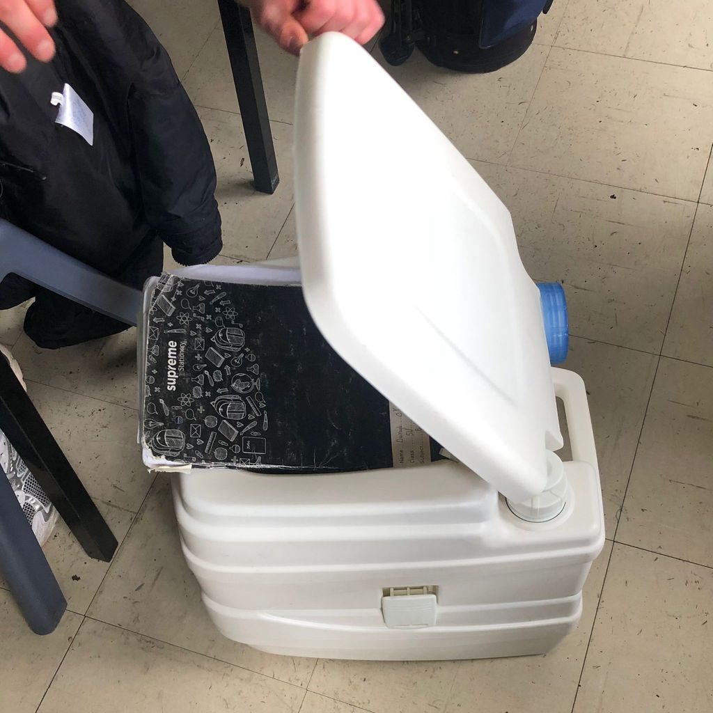 Among the highlights were shopping trolleys (borrowed with permission!), toilets, hoovers, PCs, tents, helmets, sinks, mobility scooters, suitcases, wheelbarrows and even a clothes horse carrying books and copies.